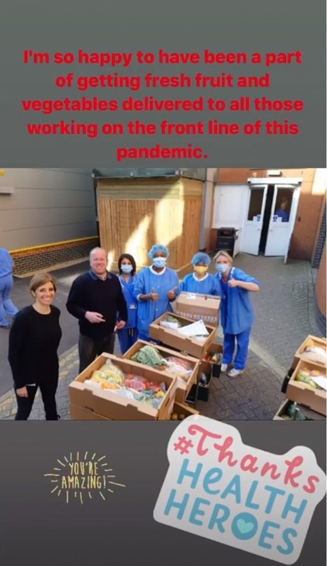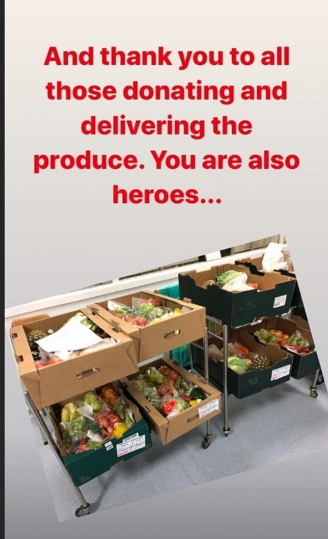அது குறித்து அவர் தன்னுடைய இன்ஸ்டாகிராம் பக்கத்தில், மேற்கு லண்டனில் உள்ள Hammersmith மருத்துவமனைக்கு வழங்கிய புதிய பழம் மற்றும் காய்கறி போன்றவற்றால் நிரப்பப்பட்ட பெட்டிகளின் படங்களை பகிர்ந்து கொண்டார்.