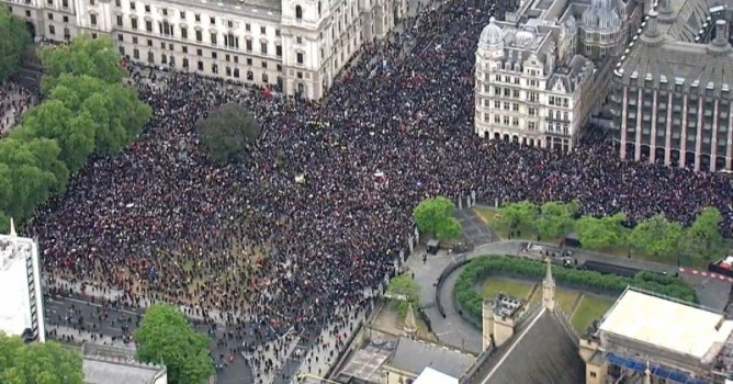 பிரித்தானியாவில் கருப்பினத்தவர் ஜார்ஜ் பிளாய்ட்டின் மரணத்திற்கு எதிர்ப்பு தெரிவித்து, அங்கிருக்கும் நகர வீதிகளில் சுமார் ஆயிரத்திற்கும் மேற்பட்ட போராட்டக்காரர்கள் கூடிய புகைப்படங்கள் மற்றும் வீடியோக்கள் வெளியாகிக் கொண்டிருக்கின்றன.