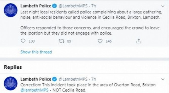 பிரித்தானியாவின் Brixton-ல் நேற்றிரவு நடந்த சட்ட விரோத நிகழ்ச்சி குறித்து பொலிசாருக்கு தகவல் கிடைத்துள்ளது.