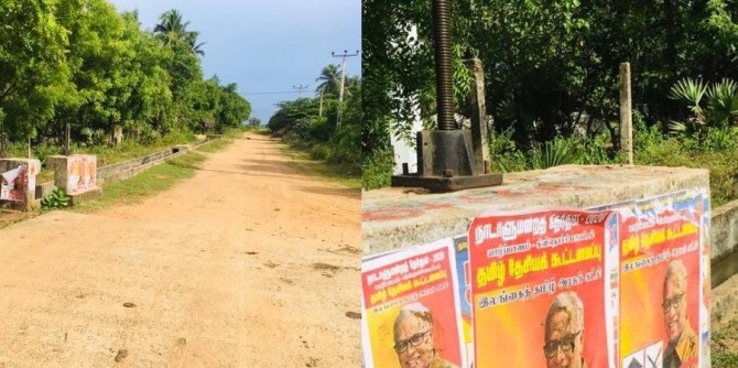 கிளிநொச்சியில் மாவட்டம் முழுவதும் ஒட்டப்பட்டுள்ள சுமந்திரன் பதாதைகளுக்கு சாணி வீசப்பட்டுள்ளது.