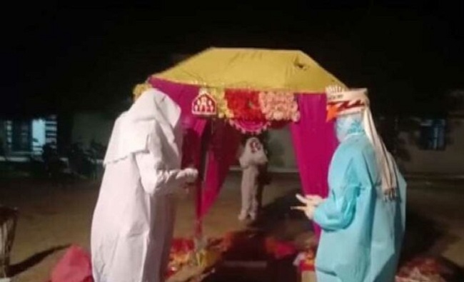 ராஜஸ்தானில் மணமகளுக்கு கொரோனா தொற்று உறுதியான நிலையில், பாதுகாப்பு உடை அணிந்து ஜோடி ஒன்று திருமணம் செய்து கொண்டது.