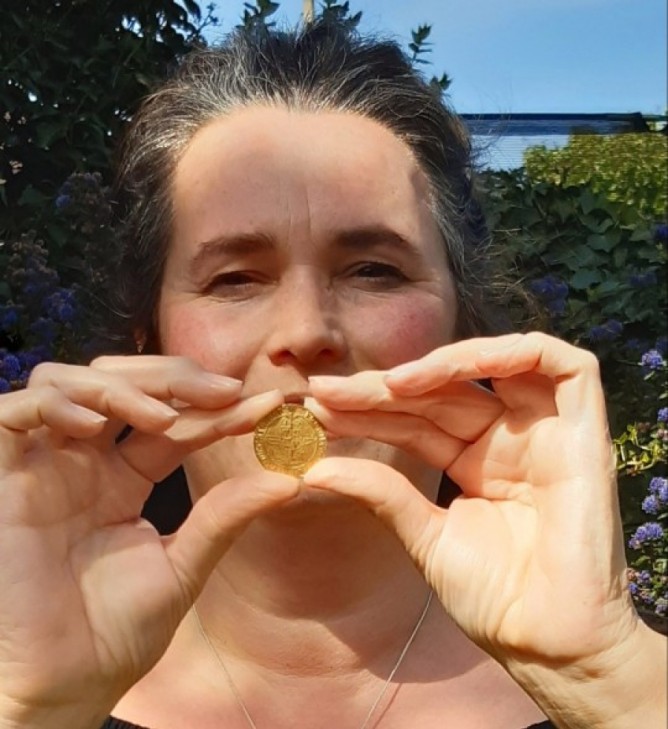 பிரித்தானியாவில் தோட்டம் ஒன்றில் மெட்டல் டிடெக்ருடன் சுத்தம் செய்து கொண்டிருந்த பெண்ணுக்கு சுமார் 2500 பவுண்ட் மதிப்புள்ள தங்கநாணயம் கிடைத்துள்ளது.