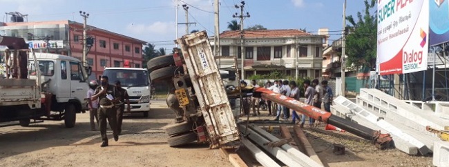 நல்லூர் ஆலயத்திற்கு பின் பகுதியில் பருத்தித்துறை வீதிக்கு அருகில் மின் கம்பங்களை தூக்கும் போது வாகனம் குடைசாய்ந்ததிலேயே இந்த விபத்து இடம்பெற்றுள்ளது.