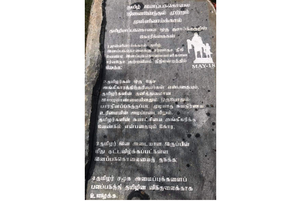 குறித்த கல்லில், தமிழினப்படுகொலை ஒரு தசாப்தத்தின் கோரிக்கைகள் என தெரிவித்து நான்கு கோரிக்கைகள் எழுதப்பட்டுள்ளமை குறிப்பிடத்தக்கது.