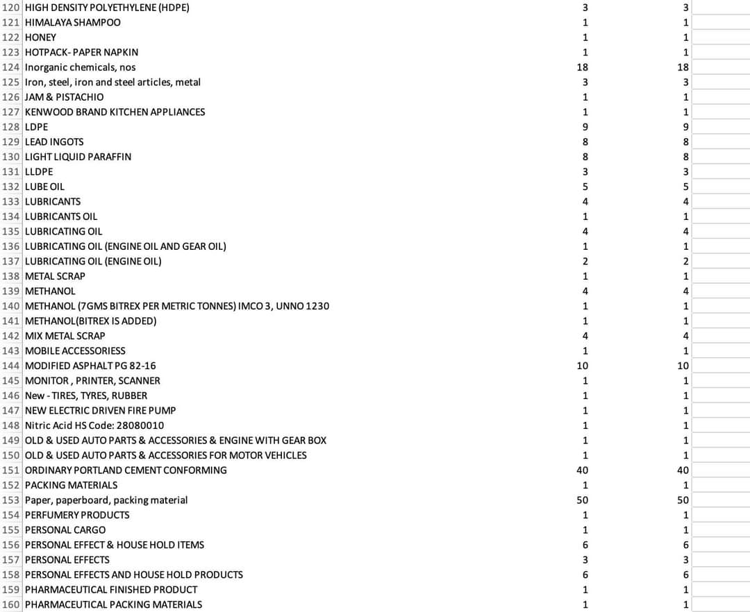 ஒரு கொள்கலனில் அபாயகரமான இரசாயனங்கள் இருந்துள்ளன, ஏனையவற்றில் பொருட்கள் மூலம் அலுமினிய பதப்படுத்துதல், அழகு சாதனப் பொருட்களுக்கான மூலப்பொருட்கள் மற்றும் உணவுப் பொருட்கள் இருந்துள்ளன.