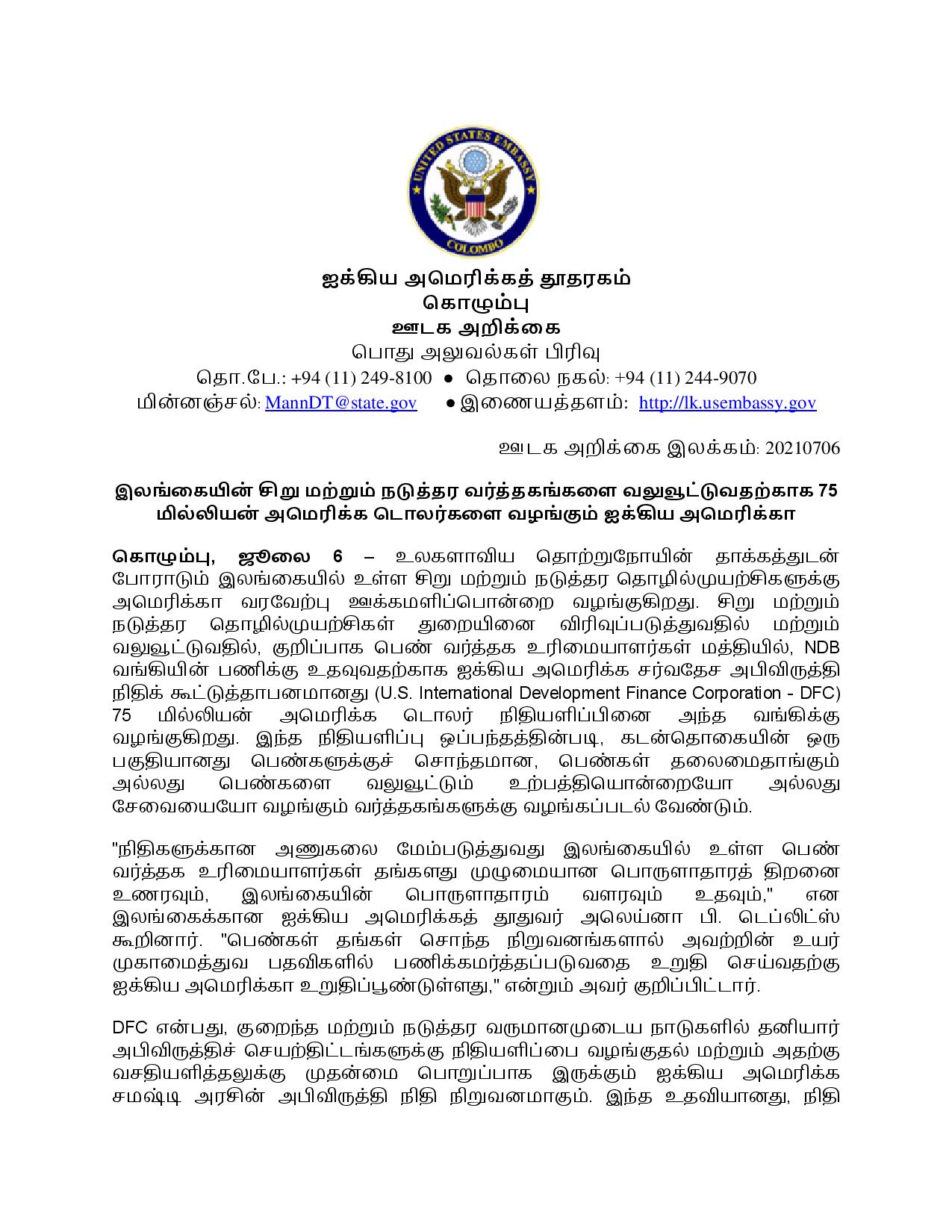 சிறிய மற்றும் நடுத்தர முயற்சியான்மைகளில் ஈடுபட்டுள்ள பெண்களுக்கு அமெரிக்க அராங்கம் 75 மில்லியன் அமெரிக்க டொலர்களை நிதி உதவியாக வழங்குகின்றது.
