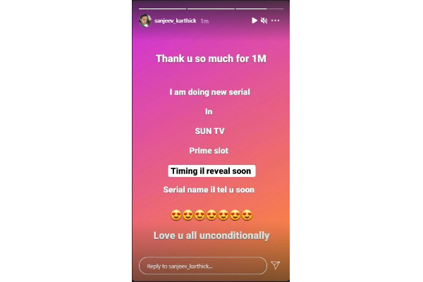 இந்த நிலையில் நடிகர் சஞ்சீவ் 7.30 PM பிரைம் டைமில் சன் தொலைக்காட்சியில் புதிய சீரியல் நடிக்கிறார் என்பது மட்டும் தகவல் வந்துள்ளது. மற்றபடி சீரியல் குறித்த எந்த தகவலும் இல்லை.