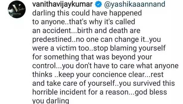 இந்நிலையில், யாஷிகாவுக்கு நடிகை வனிதா கமெண்ட் வாயிலாக அறிவுரை கூறி உள்ளார். அதில் அவர் கூறியிருப்பதாவது: “டார்லிங் யாருக்கு வேண்டுமானாலும் இது நடந்து இருக்கலாம். அதனால் தான் அதனை விபத்து என்கிறோம். பிறப்பும் இறப்பும் முன்பே முடிவு செய்யப்பட்டது. அதை எவராலும் மாற்ற முடியாது. உன் கட்டுப்பாட்டில் இல்லாத ஒரு விஷயத்திற்காக உன்னை நீயே குற்றம்சொல்வதை முதலில் நிறுத்து.
