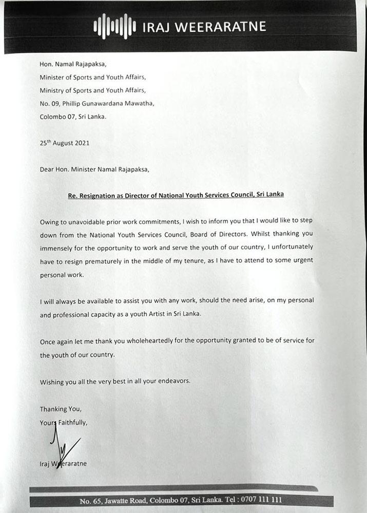 இலங்கையின் பிரபல்யமான பாடகராகிய இராஜ் வீரரத்ன, தேசிய இளைஞர் சேவைச் சபையின் பணிப்பாளர் குழுவிலிருந்து இராஜினாமா செய்துள்ளார்.
