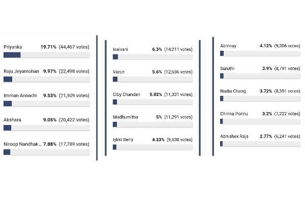 இதில் பிரியங்கா, நிரூப், ராஜு, அபிஷேக், அக்ஷரா, இமான் அண்ணாச்சி, உட்பட 15 போட்டியாளர்களும் நாமினேட் ஆனார்கள்.