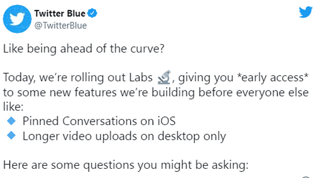 முன்னணி சமூக வலைதள சேவையான ட்விட்டர் தனது ட்விட்டர் புளூ சந்தாதாரர்களுக்கு புதிதாக லேப்ஸ் எனும் அம்சத்தினை அறிவித்து இருக்கிறது. இந்த அம்சம் கொண்டு ட்விட்டர் உருவாக்கி வரும் புது அம்சங்களை பயனர்கள் முன்கூட்டியே சோதனை செய்து பார்க்க முடியும்.