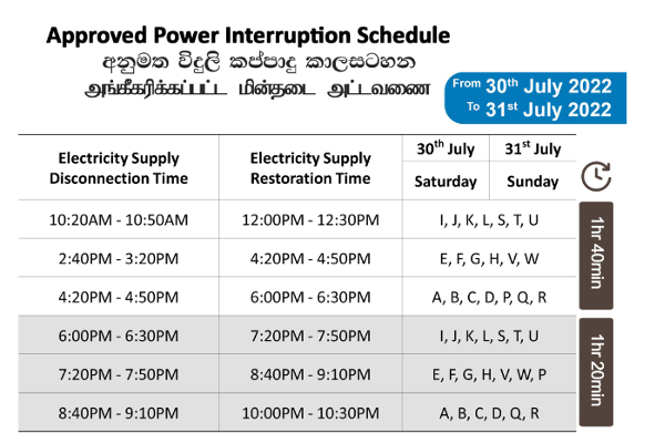 சனிக்கிழமையான இன்று (30) 03 மணித்தியாளங்களுக்கு மின்வெட்டை அமுல்படுத்துவதற்கு பொது பயன்பாடுகள் ஆணை குழு அனுமதி வழங்கியுள்ளது.
