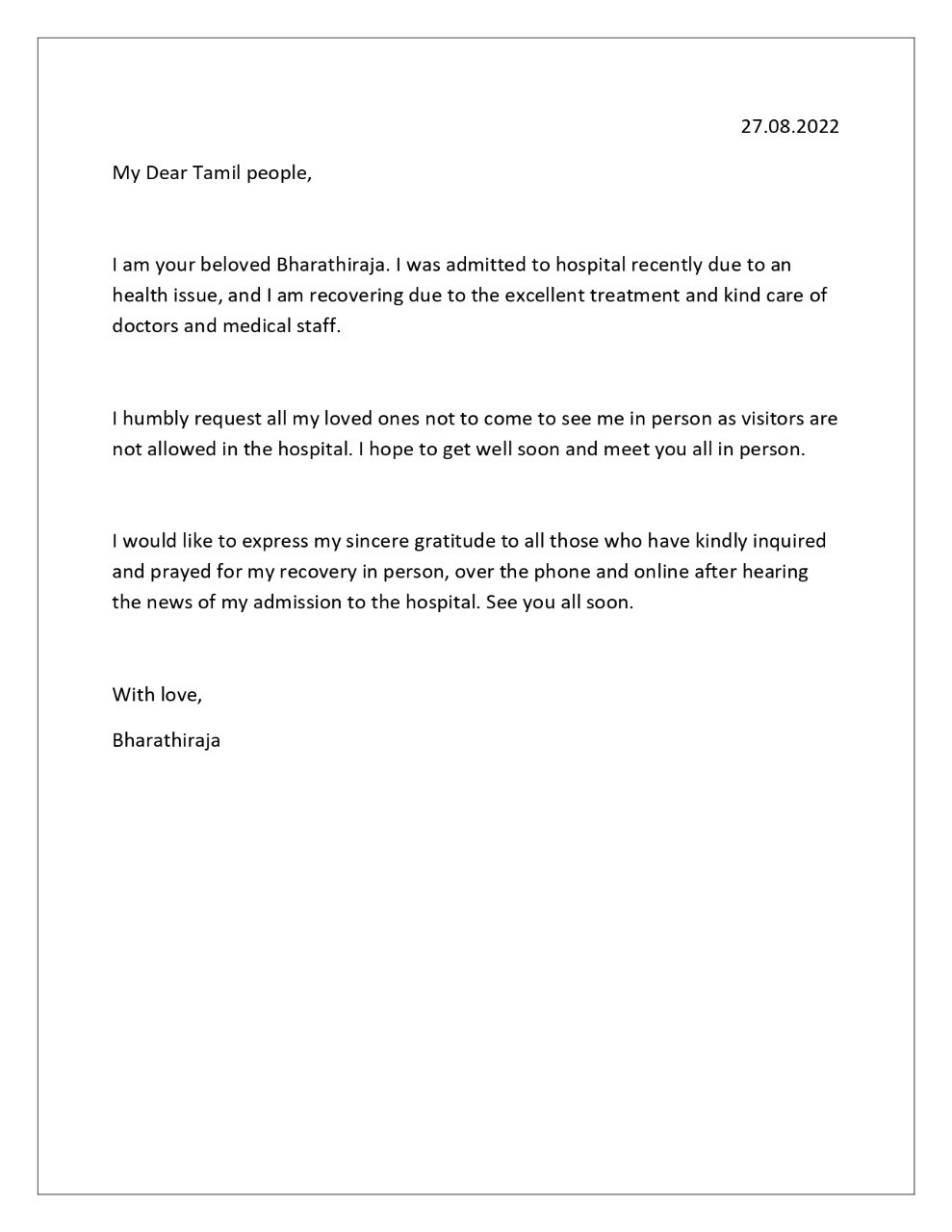 இயக்குனர் பாரதிராஜா மருத்துவமனையில் இருந்து வேண்டுகோள் ஒன்றை வைத்து இருக்கிறார்.