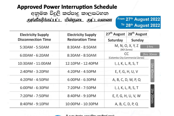 இதற்கமைய, A முதல் L வரையான வலயங்களிலும், P முதல் W வரையான வலயங்களிலும், பகல் வேளையில் ஒரு மணித்தியாலம் 40 நிமிடங்களுக்கும், இரவு வேளையில் ஒரு மணித்தியாலம் 20 நிமிடங்களுக்கும் மின்வெட்டு அமுல்படுத்தப்படவுள்ளது.