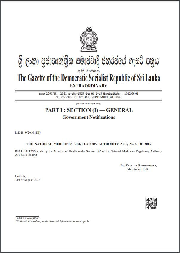 2015ம் ஆண்டு 5ம் இலக்க தேசிய ஔடதங்கள் கட்டுப்பாட்டு அதிகாரசபை சட்டத்தின் கீழ் இந்த வர்த்தமானி அறிவித்தல் வெளியிடப்பட்டுள்ளது.