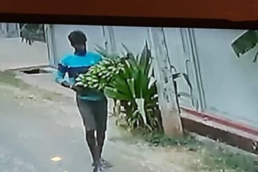 துவிச்சக்கரவண்டியில் வந்த இரு இளைஞர்கள் மதிலோரம் தொங்கிக் கொண்டிருந்த கப்பல் வாழைக்குலையை பட்டப்பகலில் மதிலில் ஏறி வெட்டி கட்டிக்கொண்டுபோகும் காட்சி கண்காணிப்புக் கமராவில் பதிவாகியுள்ளது.