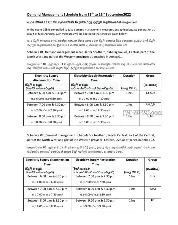 இதன்படி A,B,C,D,E,F,G,H,I,J,K,L,P,Q,R,S,T,U,V,W ஆகிய வலயங்களுக்கு மாலை 6 மணி முதல் இரவு 9 மணி வரை ஒரு மணி நேரம் மின்வெட்டு அமுல்படுத்தப்படவுள்ளதாகவும் பொதுப் பயன்பாடுகள் ஆணைக்குழுவின் தலைவர் தெரிவித்துள்ளார்.