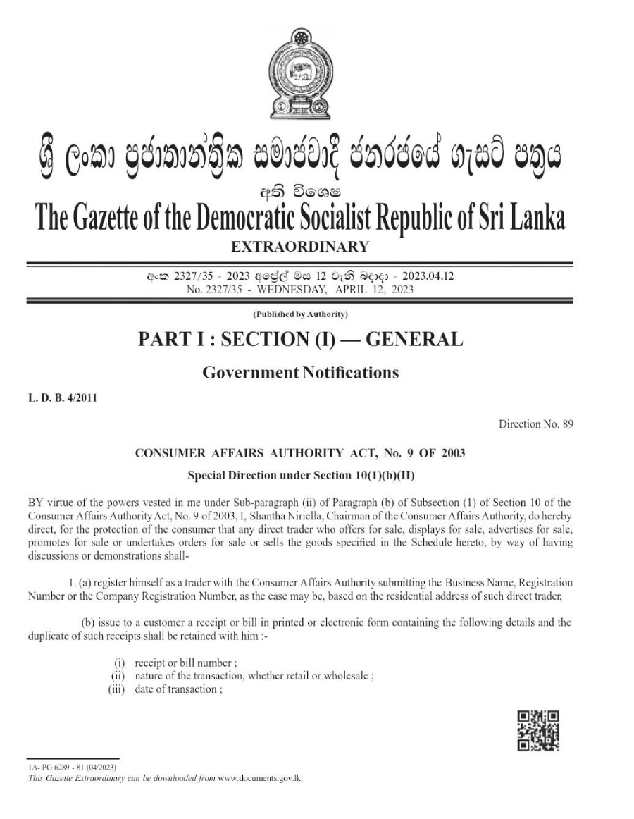 சூரிய ஒளி அமைப்புகள், தொலைபேசிகள் மற்றும் பாகங்கள், தளபாடங்கள், துப்புரவு முகவர்கள், காலணிகள், எழுதுபொருட்கள், சமையலறை பாத்திரங்கள் மற்றும் பாகங்கள், படுக்கை விரிப்புகள், மெத்தைகள் மற்றும் ஆயத்த ஆடைகளை விற்கும் அனைத்து நேரடி விற்பனையாளர்களும் நுகர்வோர் விவகார அதிகார சபையில் பதிவு செய்ய வேண்டும் என குறிப்பிடப்பட்டுள்ளது..