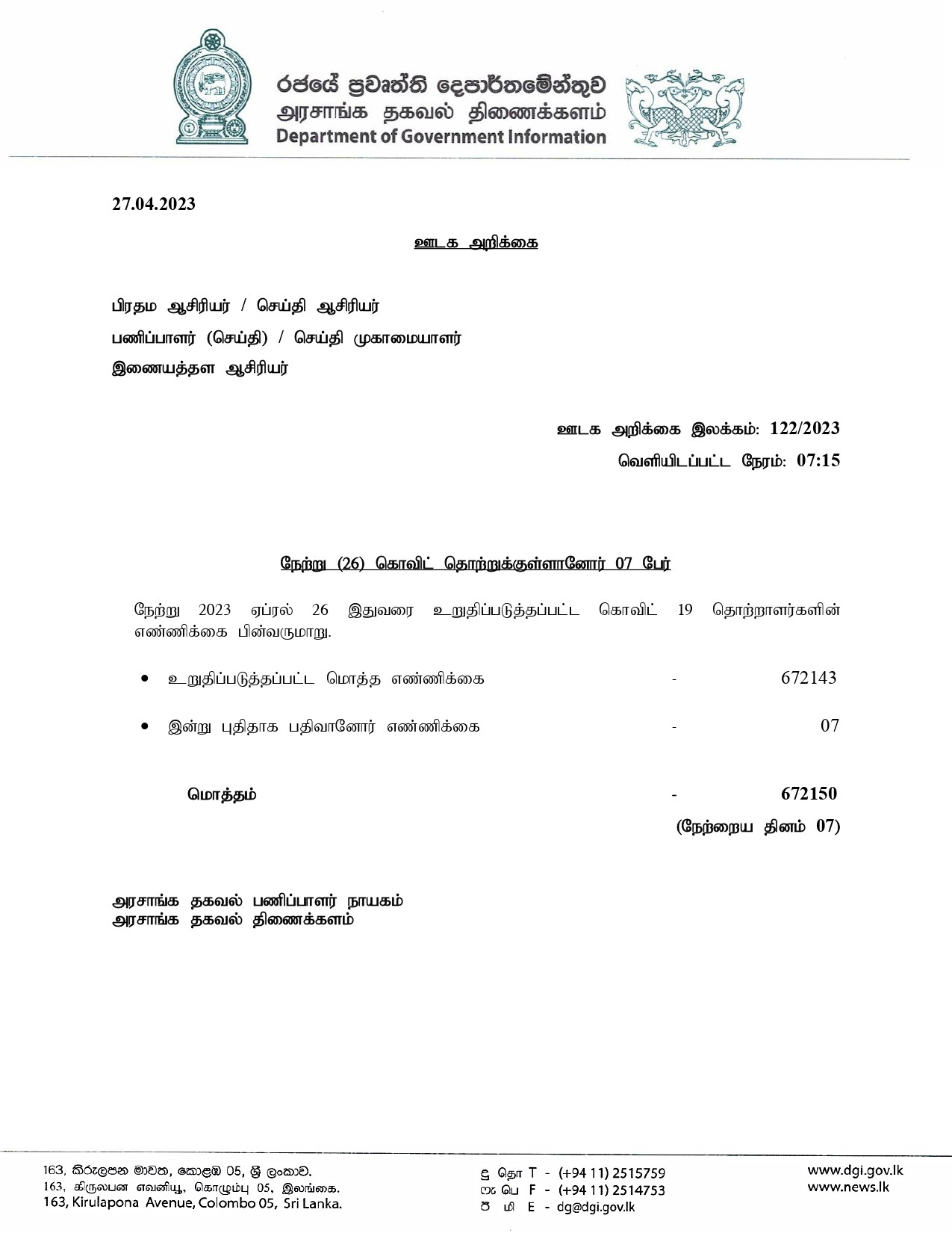 நாட்டில் நேற்றையதினம் (26 ) 7 பேர் கொவிட் தொற்றுக்குள்ளாகியுள்ளமை உறுதிப்படுத்தப்பட்டுள்ளதாக அரசாங்க தகவல் திணைக்களம் தெரிவித்துள்ளது.