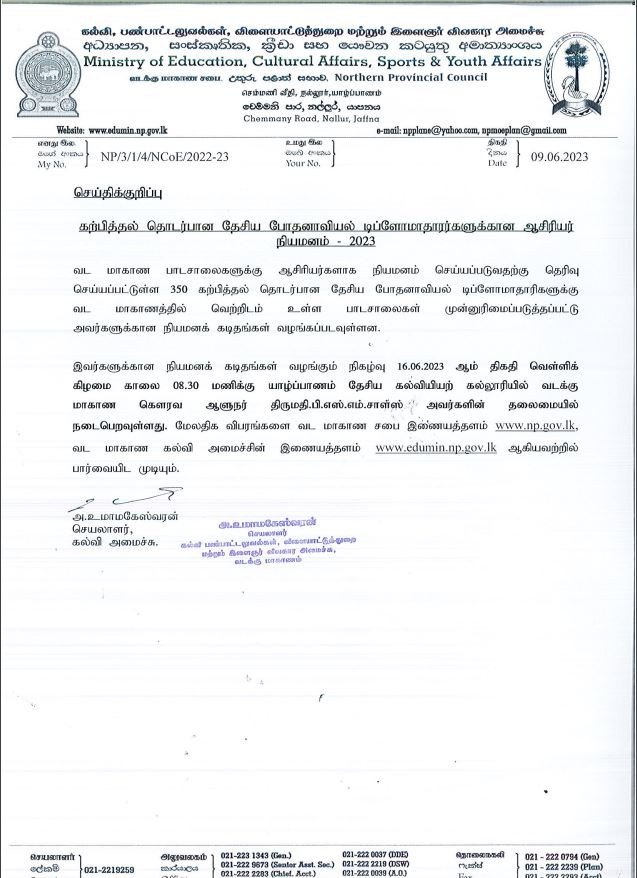 தேசிய போதனாவியல் டிப்ளோமாதாரிகளுக்கான நியமன கடிதங்கள் வழங்கும் நிகழ்வு 16.06.2023 ஆம் திகதி வெள்ளிக்கிழமை காலை 08.30 மணிக்கு யாழ்ப்பாணம் தேசிய கல்வியியற் கல்லூரியில் வடக்கு மாகாண ஆளுநர் பி.எஸ்.எம்.சாள்ஸ் அவர்களின் தலைமையில் நடைபெறவுள்ளது.