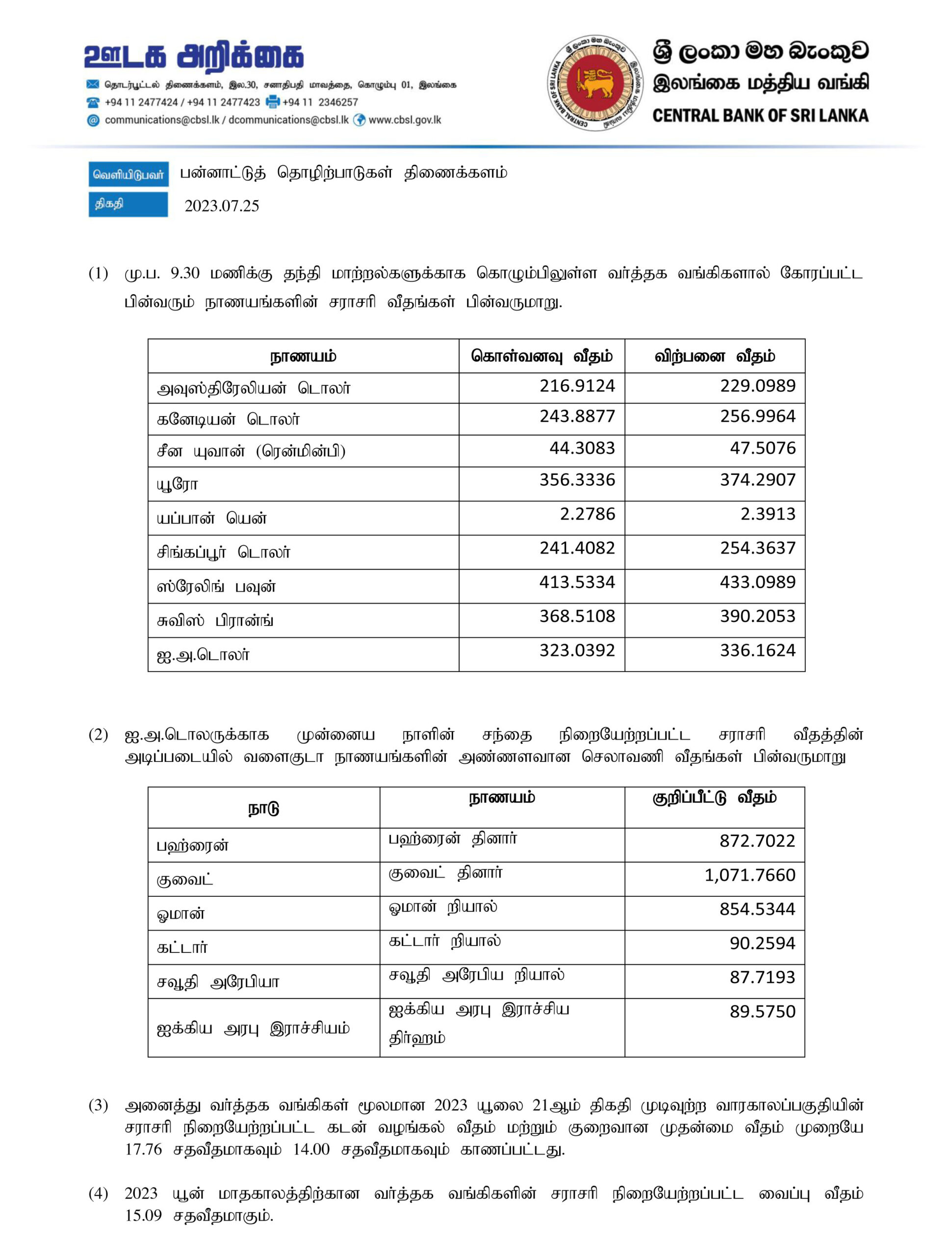 இலங்கை மத்திய வங்கியினால் வெளியிடப்பட்டுள்ள இன்றைய (25.07.2023) நாணய மாற்று விகிதங்கள் வருமாறு,