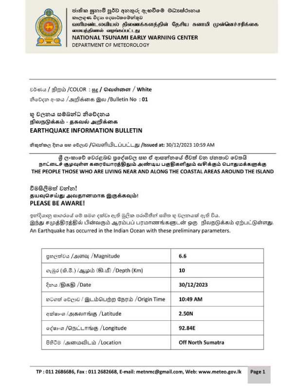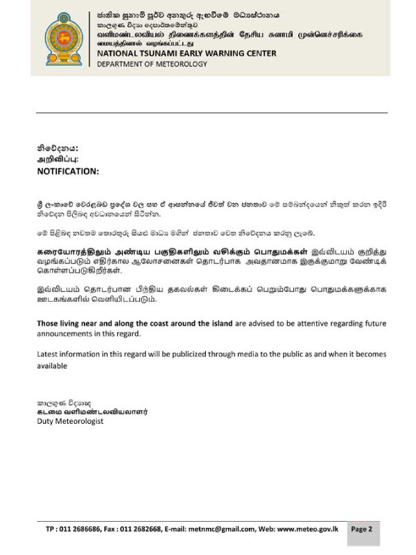 இதன்படி, இலங்கையின் கரையோர மக்கள் இது தொடர்பில் அவதானமாக இருக்குமாறு வளிமண்டலவியல் திணைக்களத்தின் சுனாமி எச்சரிக்கை மையம் அறிவுறுத்தியுள்ளது.