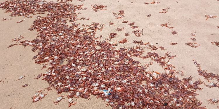 சுமார் ஐந்து தொடக்கம் ஆறு கிலோமீட்டர் நீளமுள்ள இந்த கடற்கரையில் மூன்று தொடக்கம் 4 கிலோ மீட்டர் தூரம் வரை நண்டுகள் இறந்த நிலையில் கரை ஒதுங்கி உள்ளன.