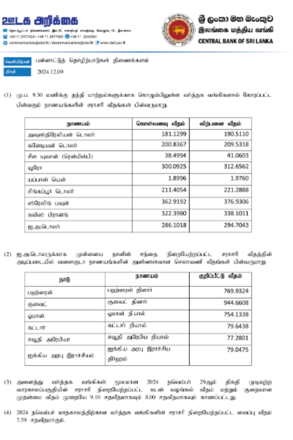 மேலும் , ஏனைய வெளிநாட்டு நாணய மாற்று விகிதங்கள் தொடர்பாக இன்று (09.12.2024) மத்திய வங்கியினால் வெளியிடப்பட்டுள்ள தகவல்கள் கீழே தரப்பட்டுள்ளது.