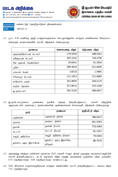 இலங்கை மத்திய வங்கி இன்றைய தினம் (17) வெளியிட்டுள்ள நாணய மாற்று விகிதத்தின் அடிப்படையில் அமெரிக்க டொலரின் விற்பனை விலை 300.6917 ரூபாவாகவும் கொள்வனவு விலை 292.2195 ரூபாவாகவும் பதிவாகியுள்ளது.