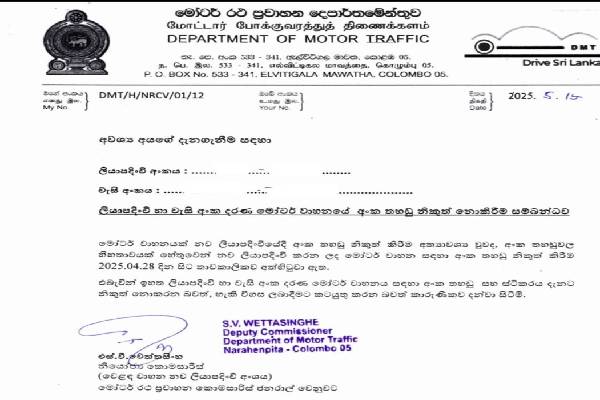 இது தொடர்பான அறிவித்தல் ஒன்றை மோட்டார் போக்குவரத்துத் திணைக்களத்தின் பிரதிப் பணிப்பாளர் வெத்தசிங்க ஊடகங்களுக்கு அனுப்பியுள்ளார்.