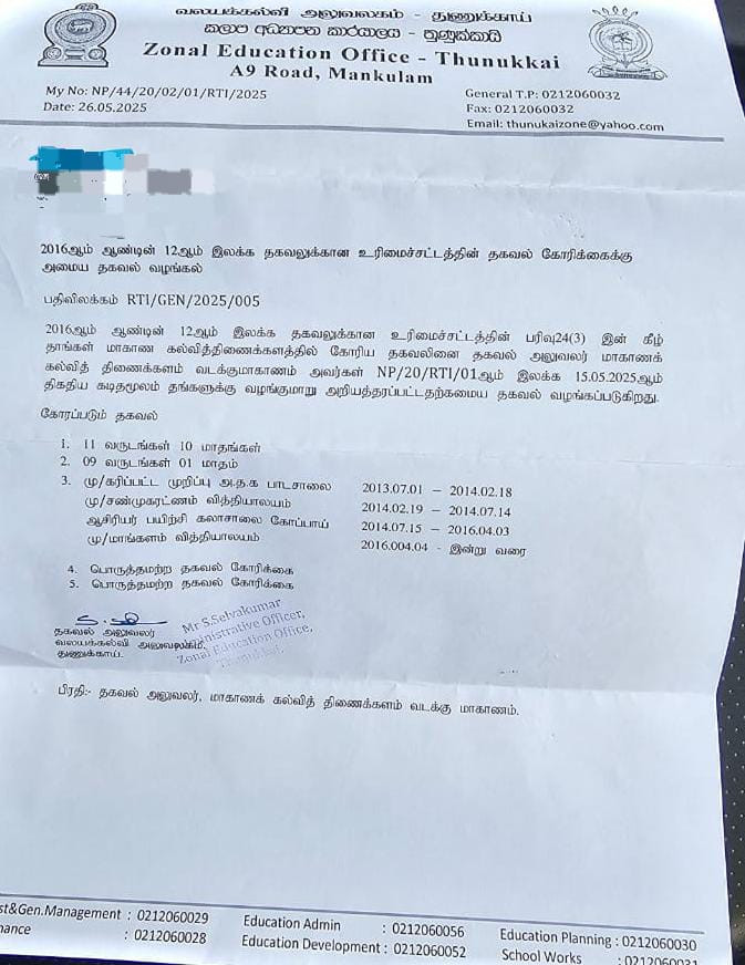 9 வருடங்களாகியும் இடமாற்றம் இன்றி துணுக்காய் வலய ஆசிரியர் ஒருவர் கடமையாற்றி வருகின்றமை தகவல் அறியும் உரிமைச் சட்டம் ஊடாக உறுதிப்படுத்தப்பட்டுள்ளது.