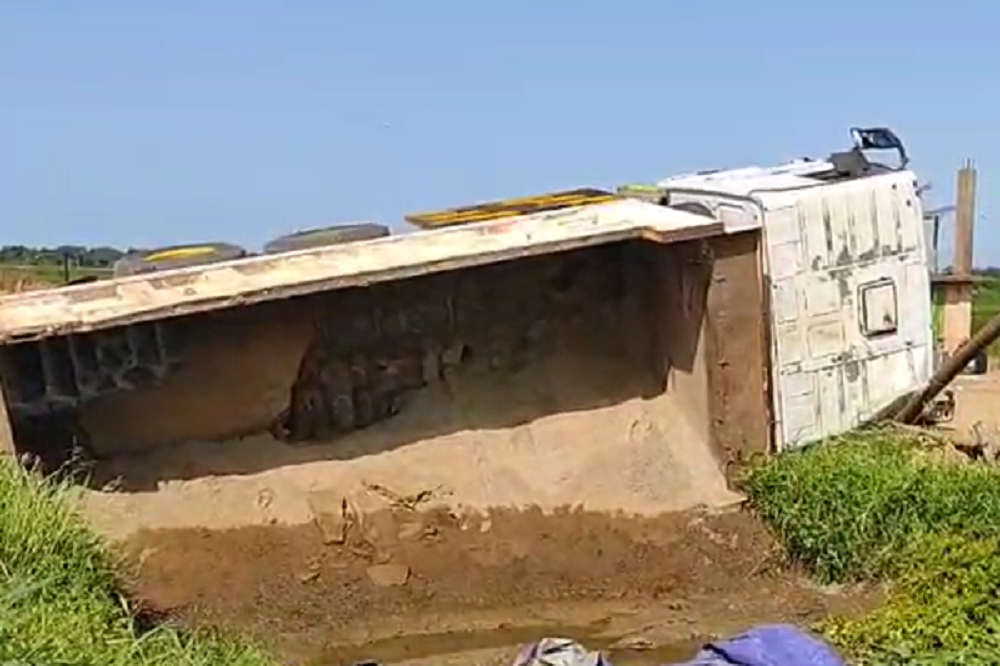 வாய்க்காலைக் கடக்க முற்பட்டபோது, பழைய பாலம் எடையைத் தாங்க முடியாமல் இடிந்து விழுந்ததால் டிப்பர் லொறி நிலைதடுமாறி குடைசாய்ந்துள்ளது.