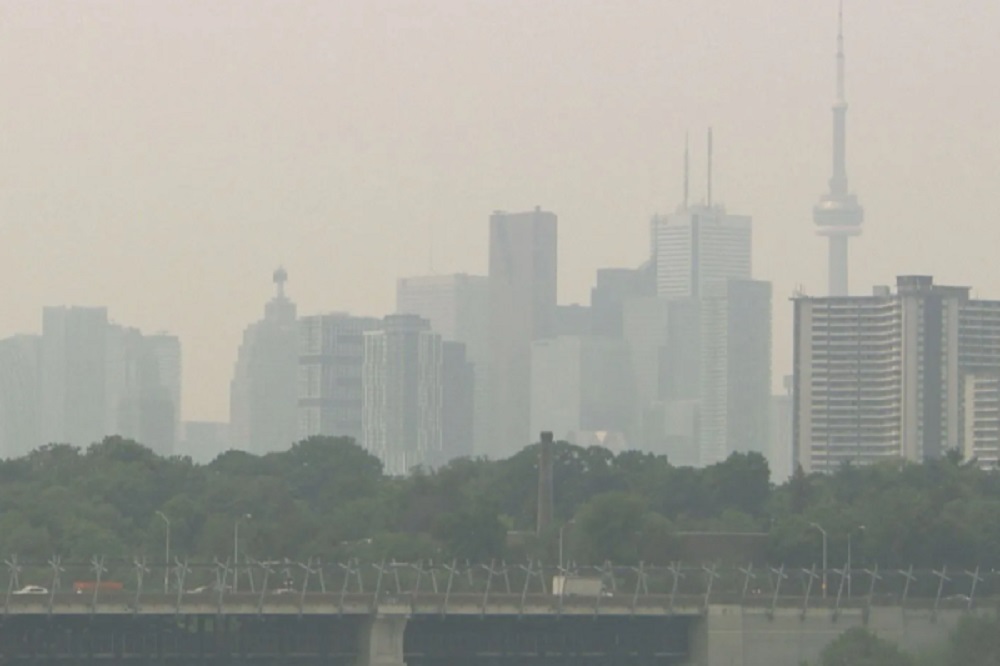 கனடாவின் மிகப்பெரிய நகரமான டொராண்டோவில் திங்கட்கிழமை மேகமூட்டமான வானம் நிலவுவதாகவும், மேலும் சுற்றுச்சூழல் கனடாவின் அதிகாரிகள் காற்றின் தர எச்சரிக்கையை வெளியிட்டனர்.