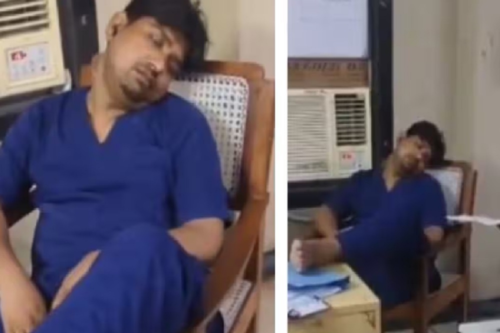 மீரட் மருத்துவமனையில் பணியில் இருந்த ஒரு மருத்துவர், மேசை மீது கால்களை வைத்துக்கொண்டு அலட்சியமாக உறங்கி கொண்டிருந்தார்.