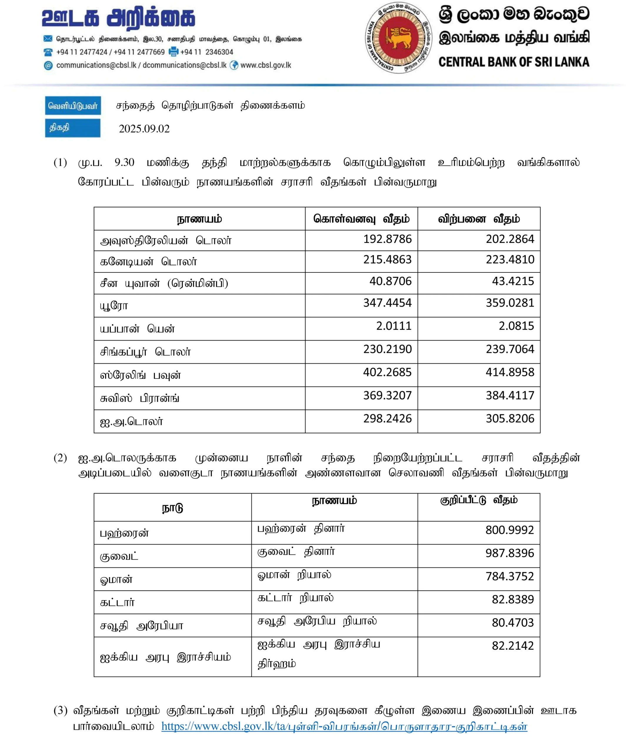 இலங்கை மத்திய வங்கி இன்று (02) வெளியிட்டுள்ள நாணய மாற்று விகிதங்களின் படி, அமெரிக்க டொலர் ஒன்றின் கொள்முதல் பெறுமதி 298 ரூபாய் 24 சதம், விற்பனைப் பெறுமதி 305 ரூபாய் 82 சதம் எனவும் தெரிவிக்கப்பட்டுள்ளது.