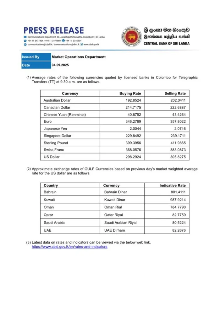 இலங்கை மத்திய வங்கியின் உத்தியோகப்பூர்வ நாணய மாற்று விபரங்களுக்கு அமைவாக,