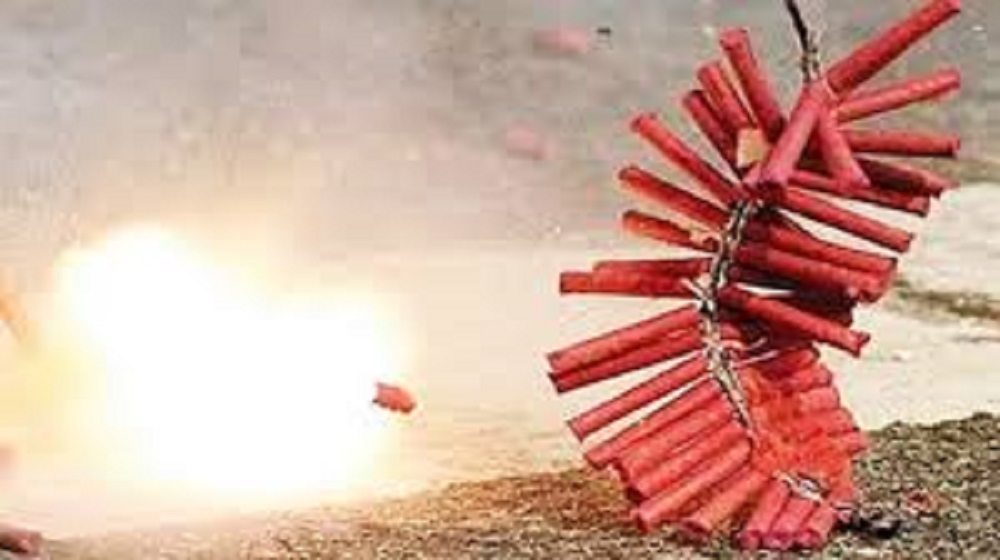 இதனால், அருகில் இருந்த ஒருவர் அந்த பட்டாசை காலால் உதைத்துள்ளார்.