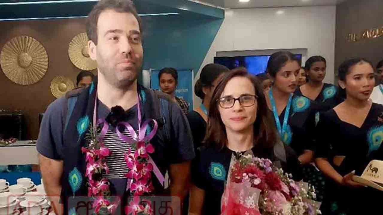 இலங்கைக்கு வருகை தந்த வெளிநாட்டவர்களான ரஃபேல் கரோன் மற்றும் அவரது மனைவி கிளெய்ர் சார்லட் ஆகியோருக்கு கட்டுநாயக்க விமான நிலையத்தில் வரவேற்பு அளிக்கப்பட்டது.